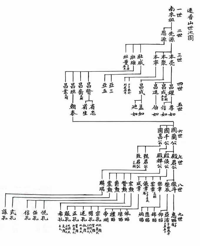 参公(敕封宗圣、居山东武城)→元公→西公→钦公→㝵公→羡公→遐公→炜公→乐公→浼公→旃公→嘉公→宝公→琰公→据公(15派、自山东徙江西庐陵)→阐公→植公→耀公→培公→德公→绚公→焕公→梓公→勰公→端公→铉公→海公→横公→兴公→隆公→钧公→谋公→丞公→略公→煬公→詠公→筠公→洪立公(徙居南丰)→延铎公→仁旺公→致饶公→易直公→叔嚮公→綝公→慿公(45派、南丰徙庐陵县北郭里)→旴公→戬(jiǎn)公→秋公→沅初公→汝和公→达公→宇公→珣公(53派、徙广州城绣衣坊)→宗公→祐之公→元叟公→谦山公(57派、携子自南海西隆徙顺德容奇)→明广公(字挺广)→宜静公→世攸公→美琼公→日辉公→之开公(63派、号南来、居容奇)→恩源公→壮雄公→昌垣公→朝泰公(自容奇分衍香山员峰,为该房香山开机祖)→国千公→士超公(字殿辉、号其光)→富业公(字宏勋、号虚谷)→七十一派望颜公...