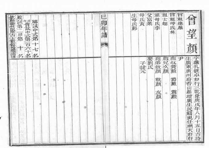 曾望颜、字瞻孔、号卓如,生于乾隆五十五年庚戌(1790年),嘉庆二十四年(1819年)己卯科举人,道光二年(1822年)壬午科进士,选庶吉士,授编修,迁御史。十五年,条奏整饬科场凡十四事,皆如所请行。迁给事中,再迁光禄寺少卿。(皇)上以望颜遇事敢言,褒勉之,转太常寺少卿。十六年,擢顺天府尹。二十年,出为福建布政使。二十三年,户部银库亏帑事发,望颜尝以御史察库,未纠发,坐夺官分偿。旋授主事。