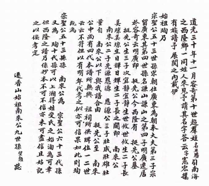 上图:道光三十年望颜公与南海西隆宪宏对谱实录。(望颜公署名为今补,易于阅读)